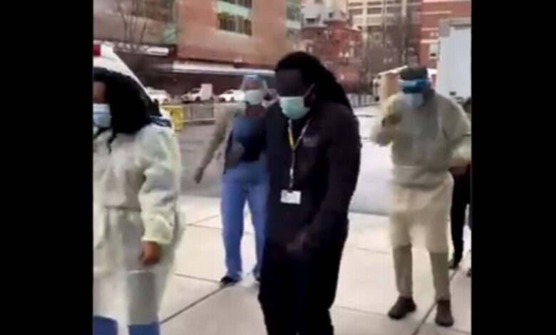 EE.UU.-Trabajadores de la salud de Boston, la capital de Massachusetts, celebran bailando en la acera la llegada de la primera vacuna COVID-19 a su hospital.