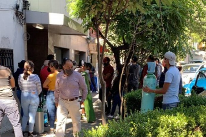 En redes sociales fueron difundidas imágenes de las largas filas que realizan en la Ciudad de México para obtener tanques de Oxígeno o rellenarlos.