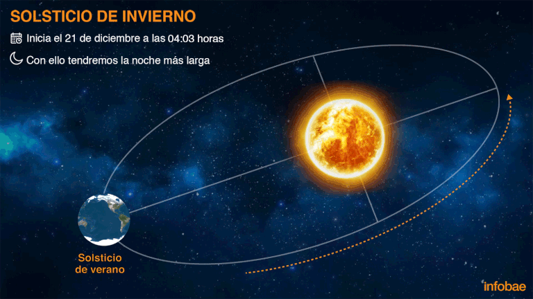 Con el solsticio de diciembre, se produce la noche más larga del año. El fenómeno se debe a la posición de la Tierra con respecto al Sol: nuestro planeta está más inclinado, por lo que el astro Rey alcanza una menor altura en el horizonte. Esto provoca que tengamos menos horas de luz solar, y que desciendan las temperaturas.