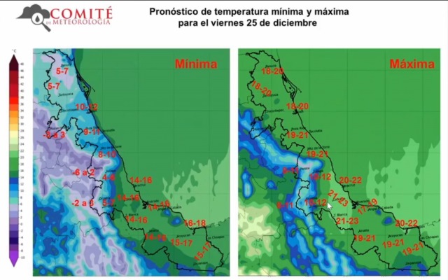 Se esperan temperaturas dónde para norte del Estado serán entre 5 y 7 grados Celsius, entre 9 a 10 desde Tuxpan hasta Nautla, entre 8 a 10 en Xalapa, Orizaba, posiblemente menores y de menos 6 a menos 2 en las zonas serranas como el Valle de Perote y en el sur del Estado, las temperaturas serán entre 14 a 16 grados.