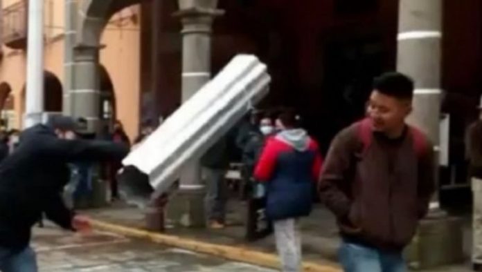 En redes sociales circula un video que muestra cómo los comerciantes “castigan” a un joven que no lleva puesto cubrebocas. En la grabación se ve a uno de los integrantes del grupo lanza una lámina en la espalda del transeúnte, quien inmediatamente saca su mascarilla y se la coloca.