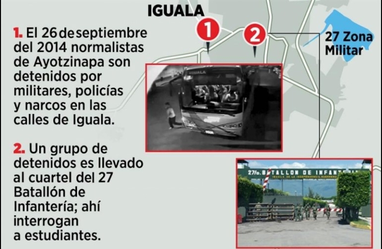 Los 43 normalistas de Ayotzinapa fueron detenidos junto con una treintena de personas más en una operación conjunta de militares, policías y sicarios. Un grupo fue interrogado en el 27 Batallón de Infantería, en Iguala, y luego entregado a los narcos para su desaparición. Algunos de los interrogados fueron entregados muertos.