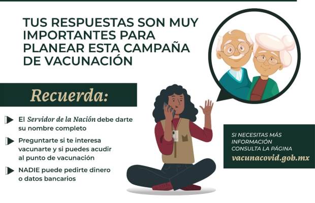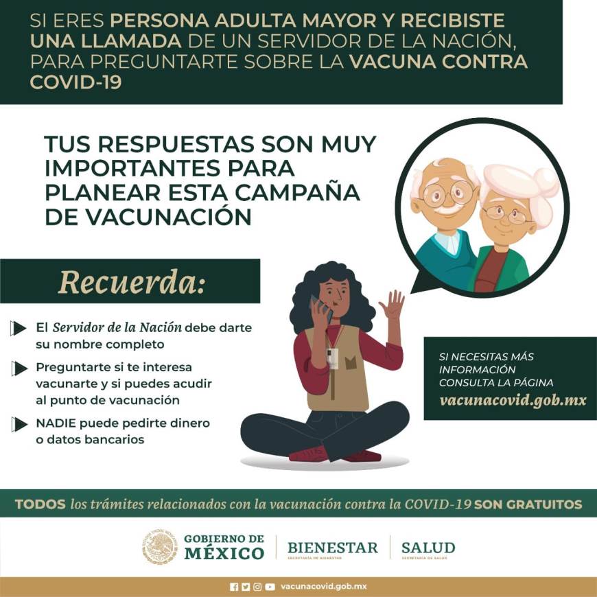 “Si eres adulto mayor y recibiste la llamada por un Servidor de la Nación para la vacuna del COVID-19; tus respuestas son muy importantes para planear las brigadas de vacunación”.