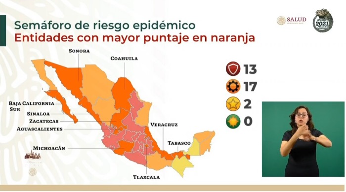 Sin embargo, hay 10 entidades de este grupo que están más cerca del rojo: Aguascalientes, Baja California, Coahuila, Michoacán, Sinaloa, Sonora, Tabasco, Tlaxcala, Veracruz y Zacatecas.