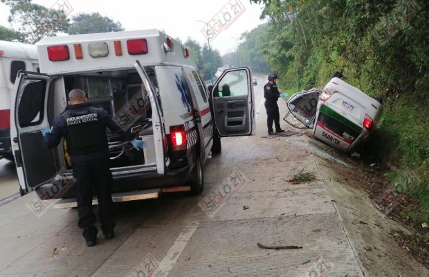 Coatepec, Ver.- Un taxi terminó volcado a un costado del fatídico bulevar Xalapa-Coatepec esta mañana, el conductor y un pasajero fueron auxiliados por paramédicos de la agrupación Panteras de la Secretaría de Seguridad Pública.