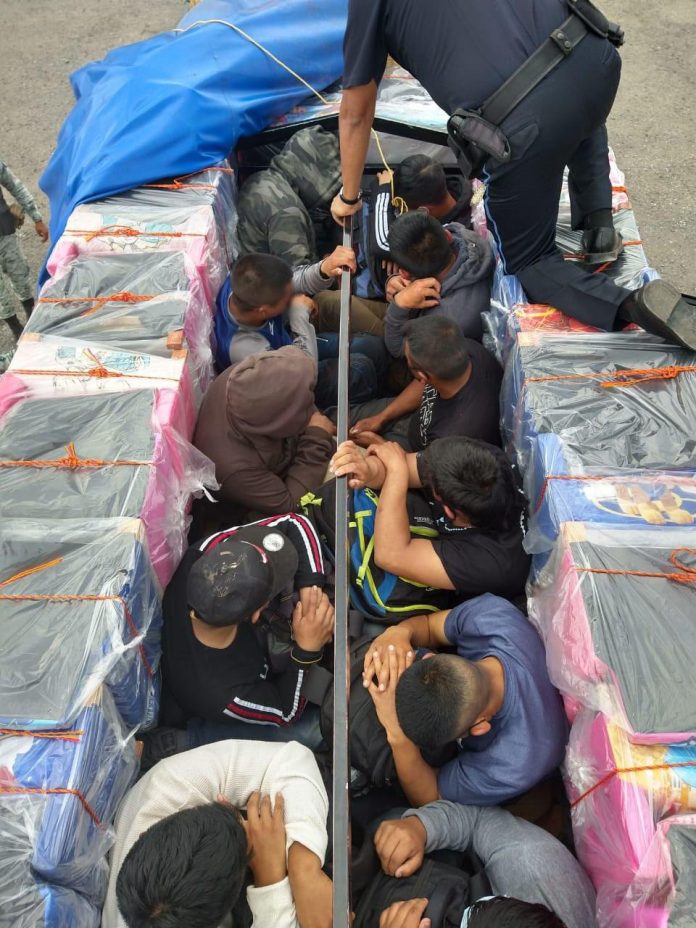 En el municipio de Las Choapas, estado de Veracruz, integrantes de la Guardia Nacional en coordinación con personal del Instituto Nacional de Migración (INM), auxiliaron a 12 personas provenientes de Guatemala, quienes eran transportadas en un compartimiento de madera adaptado a una camioneta pick up, en condiciones de hacinamiento.