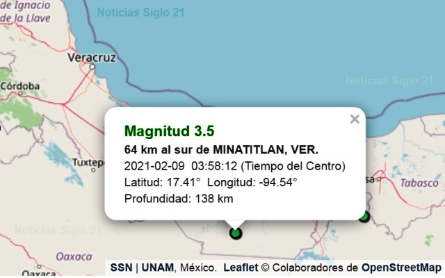 Fue a las 03:58 horas de este martes que el SSN registró el sismo que alcanzó una magnitud de 3.5, localizando su epicentro 64 kilómetros al Sur del municipio de Minatitlán, Veracruz.
