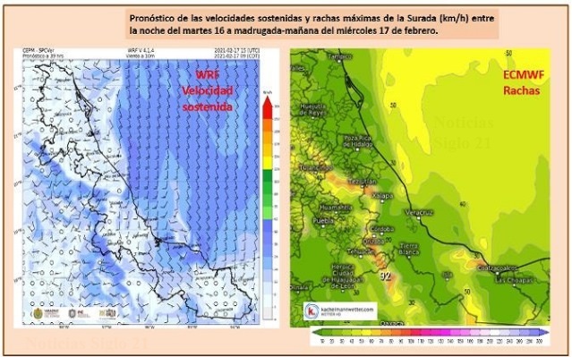 Miércoles 17: Surada rachas de 70 a 85 km/h en las regiones del valle de Perote y Jesús Carranza-Acayucan, de 60 a 80 km/h en la zona de Orizaba. Viento del Oeste y Noroeste en la costa norte de 35 a 45 km/h. Probabilidad baja de precipitaciones. Ambiente relativamente caluroso a caluroso al mediodía-tarde.