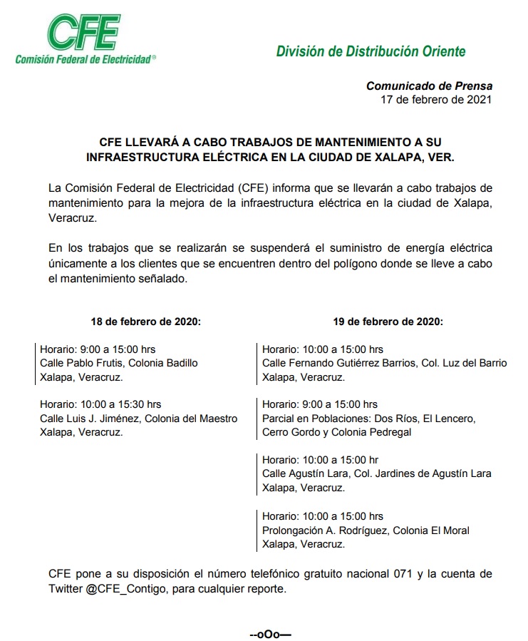 Serán algunas calles de las colonia Badillo, Colonia del Maestro, en donde técnicos de la Comisión Federal de Electricidad «llevarán a cabo trabajos de mantenimiento para la mejora de la infraestructura eléctrica en la ciudad de Xalapa».
