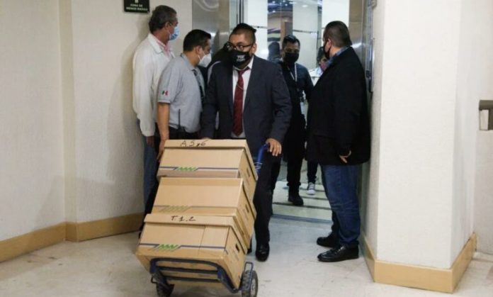 Las seis cajas con las posibles pruebas contra García Cabeza de Vaca fueron llevadas en dos diablitos a la Dirección de Asuntos Jurídicos de la Cámara de Diputados.
