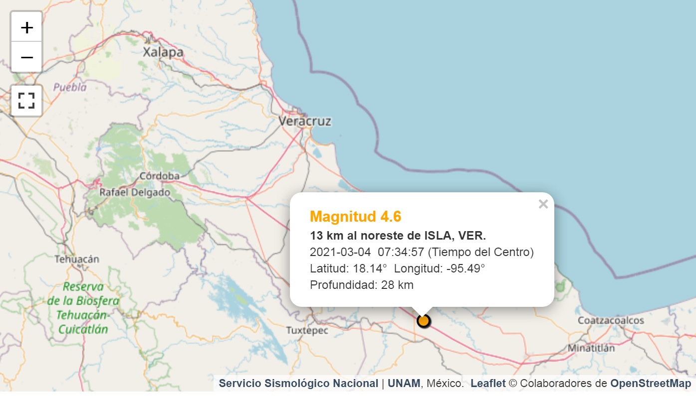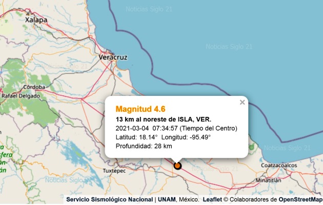 Un sismo de intensidad 4.6 fue registrado por el Servicio Sismológico Nacional (SSN) esta mañana, en el municipio de Isla del Estado de Veracruz.
