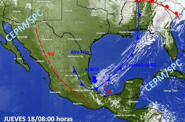 Sistemas meteorológicos y su previsión: El frente frío 43 se localiza desde Kentucky, EUA, hasta el centro de Veracruz, estimándose cruce el sur al mediodía y la Península de Yucatán por la tarde, impulsado por una potente masa de aire frío, y acompañado de una línea de cortante que cruza Los Tuxtlas a esta hora.