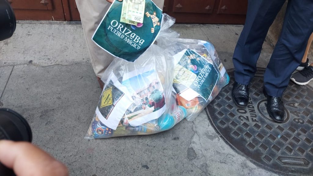 Los inconformes mostraron una bolsa con el logo del PRI y una la leyenda que decía “Orizaba Pueblo Mágico” y “Sonríe Orizaba”, señalando que incluso las despensas están mejores a las que reparte del Gobierno del Estado.
