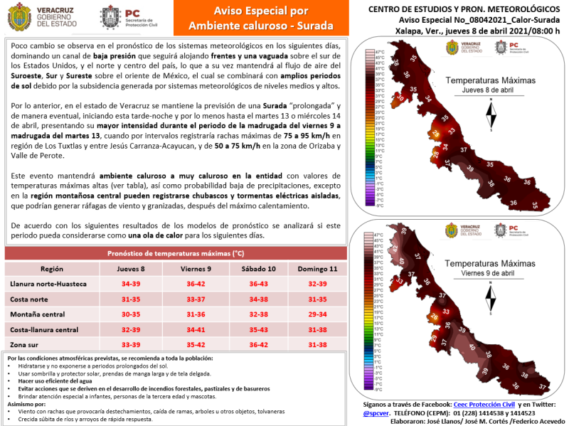 Xalapa, Ver.- El Centro de Estudios y Pronósticos Meteorológicos emitió un «Aviso Especial» por ambiente caluroso y efecto de Surada con rachas de 75 a 95 Km/h que afectará la entidad veracruzana desde este miércoles.