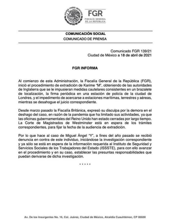 Al comienzo de esta Administración, la Fiscalía General de la República (FGR), inició el procedimiento de extradición de Karime “M”, obteniendo de las autoridades de Inglaterra que se le impusieran medidas cautelares consistentes en un brazalete de localización, la firma periódica en una estación de policía de la ciudad de Londres, y el impedimento de acercarse a estaciones marítimas, terrestres y aéreas, mientras se desahogue el juicio correspondiente.
