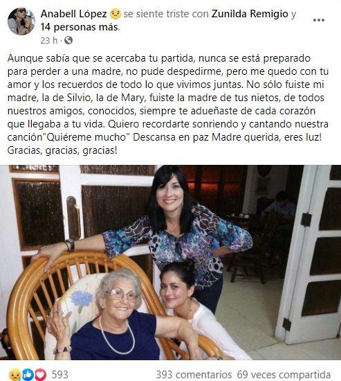 En una publicación de Facebook la hermana del cantautor, Anabell López, lamentó el fallecimiento de su madre asegurando que no estaba preparada para esta perdida.