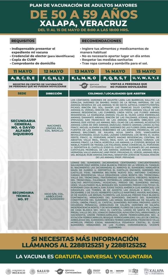 Será en la Secundaria General No.4 David Alfaro, en la Secundaria Técnica No. 97, Gimnasio «Nido del Halcón» USBI y en la Escuela Normal Veracruzana donde se instalarán los módulos para brindar atención a todos los adultos de 50 a 59 años.