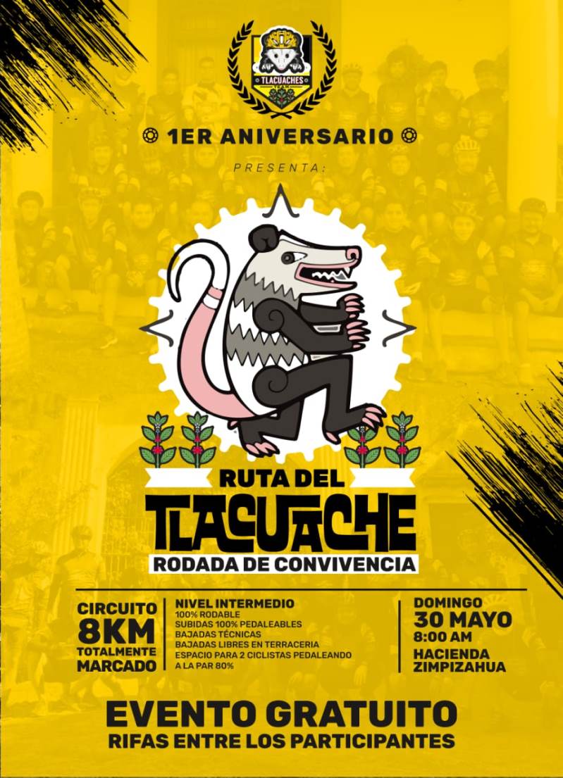 Coatepec, Ver.- A rodar con la familia ciclista, invitó el grupo “Tlacuaches Team” que se efectuará el próximo 30 de mayo en el municipio de Coatepec alrededor dela Hacienda Zimpizahua.