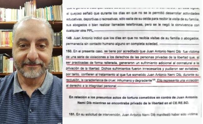 Agrega que “Dichos sufrimientos fueron innecesarios y pudieron ser evitables por tanto confieren al tratamiento al que fue sometido Juan Antonio Nemi Dib durante su reclusión, la característica de cruel, inhumano y degradante. Ello representa una violación al derecho a la integridad personal”.