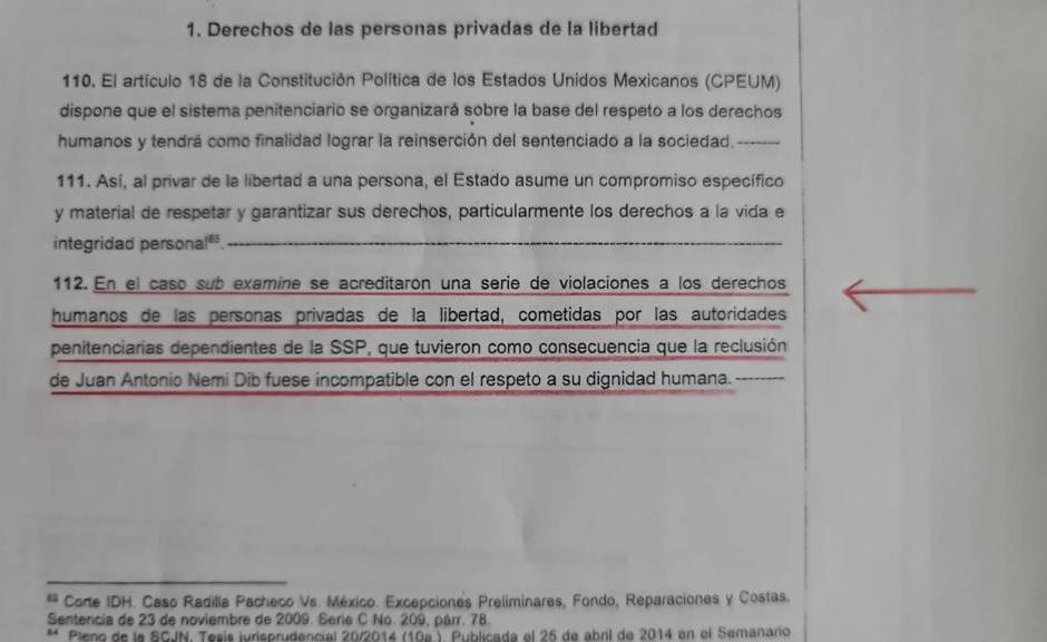 La CEDH presidida por Namiko Matzumoto Benitez refiere “se tiene por acreditado que Juan Antonio Nemi Dib fue víctima de una serie de violaciones a los derechos de las personas privadas de la libertad que al ser practicadas de forma reiterada, generaron un sufrimiento adicional al connatural a la privación de la libertad”.