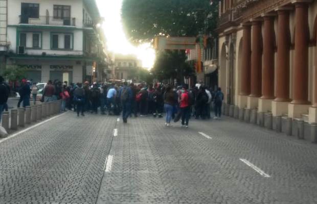 Cerca de cien personas que dijeron ser trabajadores de la Alcoholera de Orizaba llegaron esta mañana hasta la Plaza Lerdo e iniciaron la manifestación con pancartas y lonas, terminando en el cierre de la calle Enríquez.
