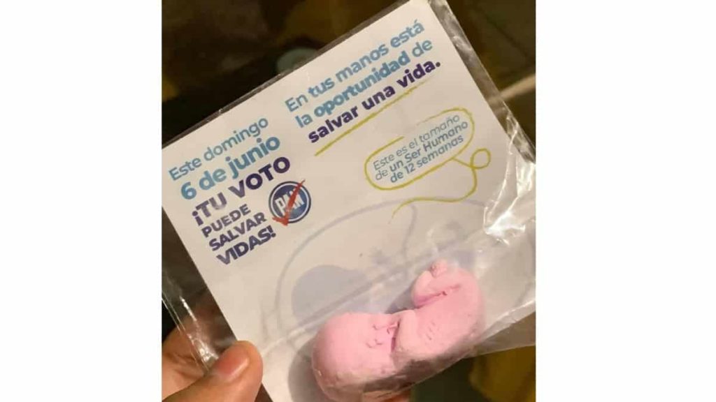 El feto de yeso viene acompañado de un mensaje —obviamente con las siglas del PAN— que pide el voto de la ciudadanía este 6 de junio y aboga por salvar vidas. Esa es la propuesta de quien ha sido presidente del Frente Nacional por la Familia en Jalisco y que ha reiterado que la campaña con los fetos molesta porque es “verdad”.