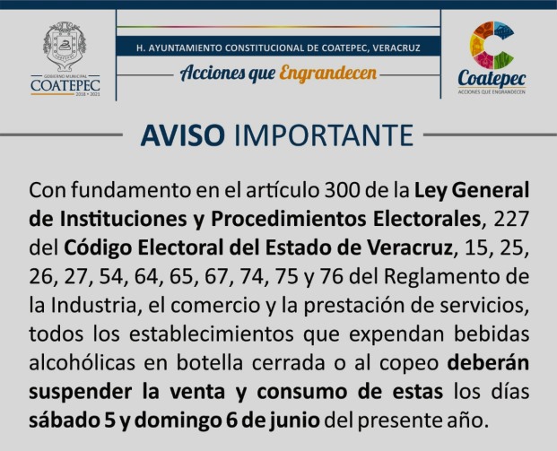«Con fundamento en el artículo 300 de la Ley General de Instituciones y Procedimiento Electorales, 227 del Código Electoral del Estado de Veracruz, 15, 25, 26, 27, 54, 64, 65, 67, 74, 75 y 76 del Reglamento de la Industria, el Comercio y la Prestación de Servicios; todos los establecimiento que expendan bebidas alcohólicas en botella cerrada o al copeo, deberán suspender la venta y consumo de estas los días sábado 5 y domingo 6 de junio del presente año».