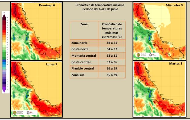 *Costa y llanuras del centro*: Disminución de los nublados conforme avance la mañana, parcialmente despejado el resto del día, aumentando los nublados y la probabilidad de lluvias con tormentas (actividad eléctrica y ráfagas de viento) aisladas de esta noche a las primeras horas de la mañana. Acumulados estimados en 24 horas de 5 a 20 mm, siendo probables mayores a este rango de forma más dispersa. Viento variable fijándose al Norte y Noreste de 20 a 35 km/h. Los valores de la temperatura máxima con poco cambio, ambiente templado por la noche-madrugada. Tmáx. 34 a 37°C en llanura y de 32-34°C en costa. Tmín. 24-27°C.
