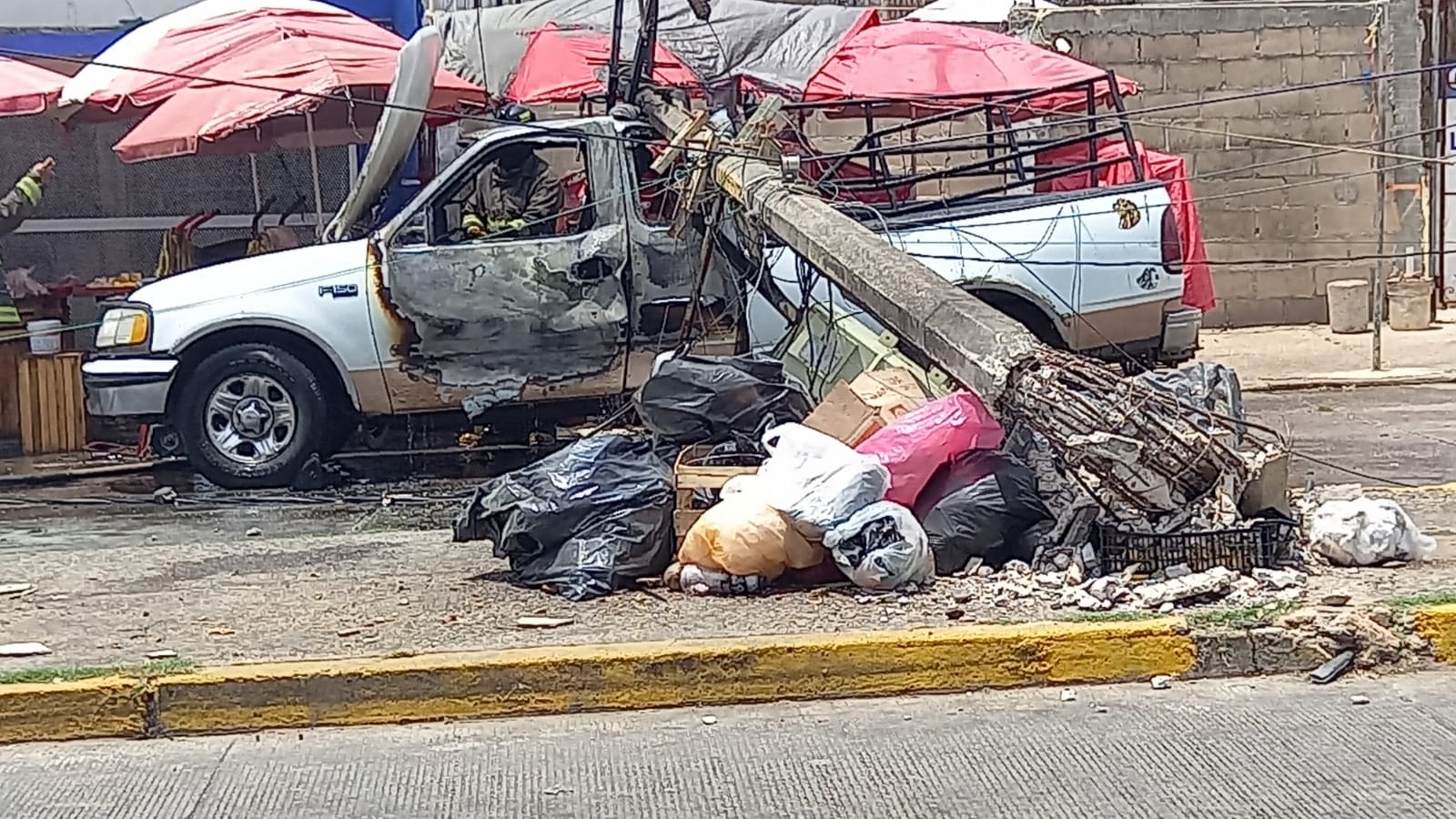 Un imprudente conductor de la limpia publica de Coatzacoalcos, ocasionó que un poste que ardia en llamas cayera sobre una camioneta y esta de inmediato ardiera en llamas, esto en el centro de Coatzacoalcos.