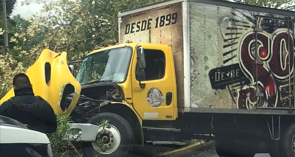 Fue antes de llegar a la avenida Lázaro Cárdenas, en donde el conductor de un camión de una empresa de cerveza  perdió el control de la unidad y se impactó contra un árbol, el cual quedó derribado en el cantil contrario que conduce al centro de la ciudad.