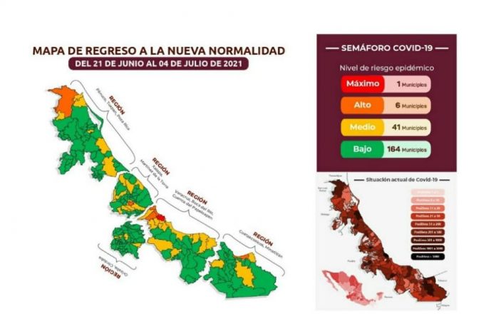 El Gobierno Federal ha determinado que, del lunes 21 de junio al domingo 04 de julio, Veracruz permanecerá en color amarillo (riesgo medio) del Semáforo de Riesgo Epidemiológico. A nivel estatal queda de la siguiente forma: