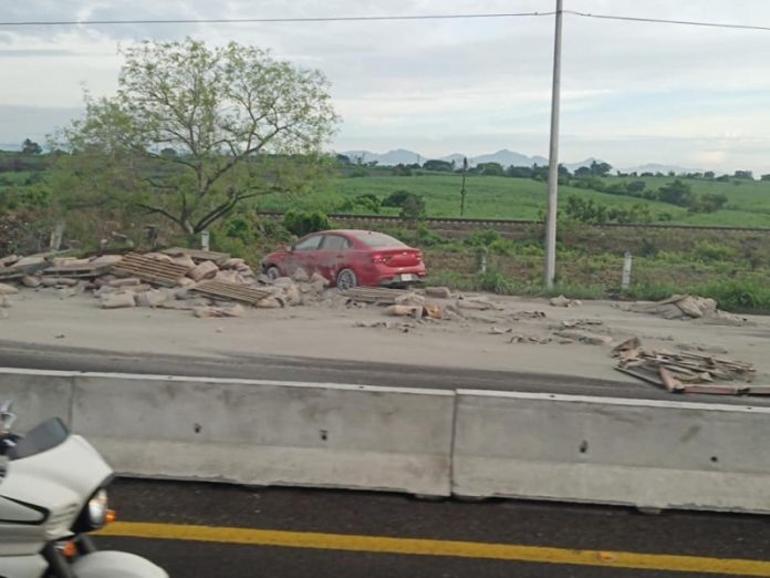El accidente se registró alrededor de las ocho de la mañana, cuando el segundo remolque cargado de cemento que arrastraba la pesada unidad volcó por completo, impactando la carga a un vehículo particular de la marca Kia, con placas del estado de Veracruz.