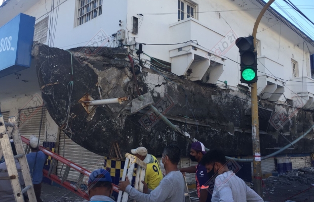 Veracruz, Ver.- El alero del edificio «Florencia» ubicado en la esquina de la avenida Hidalgo y Canal de la zona centro, colapsó la noche de este lunes; hasta el momento no se reportan heridos.