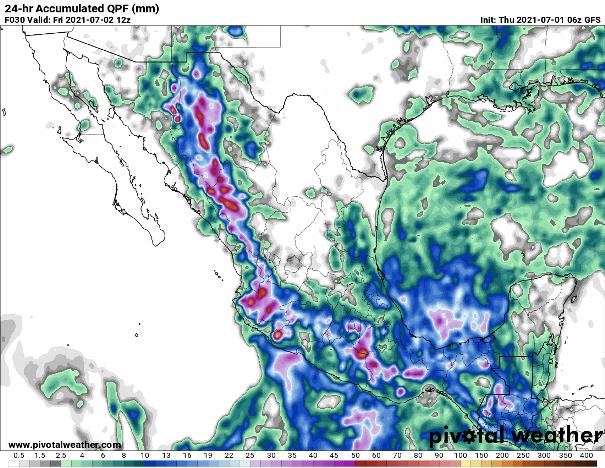 En las próximas 24 horas se esperas lluvias en la mayor parte del país con los máximos acumulados en Chihuahua, oeste de Durango, Jalisco, Michoacán, Ciudad de México, Tlaxcala, Puebla, Veracruz, Morelos, Guerrero, Oaxaca, Tabasco y Chiapas. Amplios sectores de la Península de Baja California, Coahuila, Zacatecas, Nuevo León, Tamaulipas y san Luis Potosí, con baja o nula probabilidad de precipitaciones. Los valores de la temperatura máxima con poco cambio o ligero aumento (en el norte) y con los valores más altos de la temperatura máxima en el norte de Baja California, noroeste de Sonora, y frontera de Coahuila y Tamaulipas con Estados Unidos. En costas del Golfo de México y mar Caribe se espera viento del sureste, este, noreste y norte con velocidades de 20 a 35 km/h y rachas de 40 a 55 km/h en costas de Texas, Sonda de Campeche y costas de Quintana Roo. En el litoral de Pacífico se pronostican las brisas normales en el resto. Asimismo, seguirán las rachas en las zonas de tormenta.