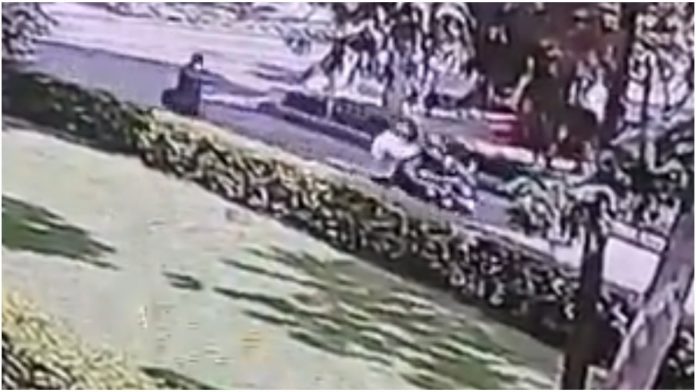 Una cámara de seguridad logró captar el momento exacto en que un hombre va caminando por la calle mientras habla por el celular, esto sin percatarse que detrás de él otro sujeto se acercaba para arrebatarle el móvil. Tras lograr su cometido, el ladrón se subió a una motocicleta conducida por su cómplice y trataron de huir del lugar, pero la víctima tuvo otros planes.