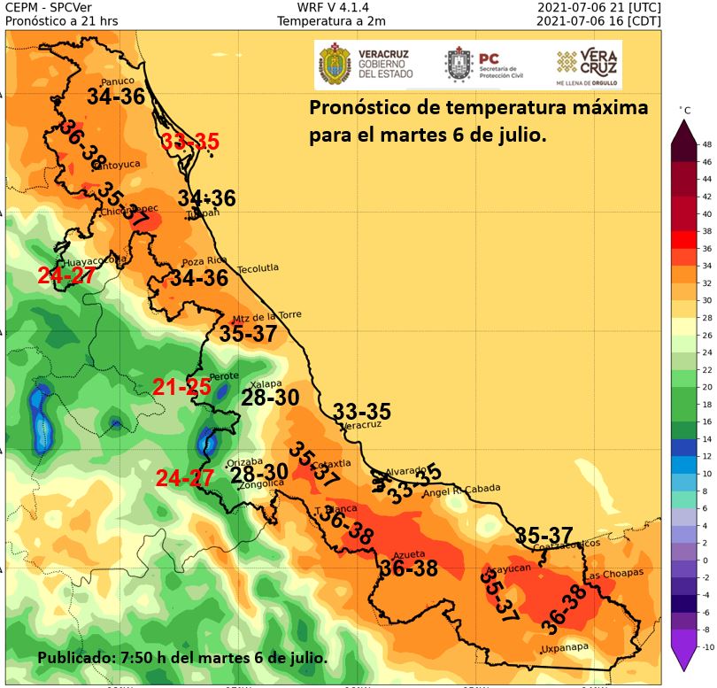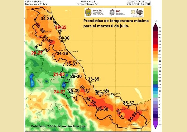 En su informe meteorológico, el organismo dependiente de la Secretaría de Protección Civil de Veracruz, agregó que algunas tormentas podrían venir acompañadas de actividad eléctrica, ráfagas de viento y posible caída de granizo, en montañas del centro, y aumente la probabilidad en las zonas norte y sur por la tarde-noche, con las máximas en cuencas del norte.
