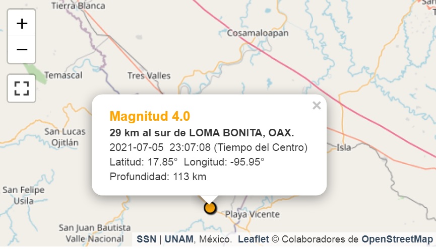 El sismo, fue registrado a las 23:07 horas de este lunes, siendo localizado por el SSN a 29 kilómetros al Sur de Loma Bonita, Oaxaca.