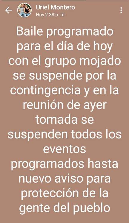 «El Baile programado para el día de hoy (sábado) con el grupo Mojado, se suspende por la contingencia (sanitaria del Covid-19), se suspenden todos los eventos programados hasta nuevo aviso», dijo Uriel Montero