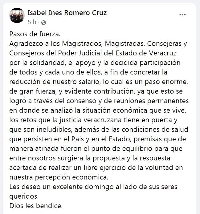 Xalapa, Ver.- Este domingo la presidenta del Tribunal Superior de Justicia Isabel Inés Romero Cruz, anunció vía Facebook, la reducción de los salarios a Magistrados.