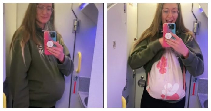 En el video, publicado el pasado 29 de junio por la usuaria de TikTok @miniadvantures, se ve cómo la mujer se coloca una bolsa bajo la sudadera para luego colarla en la cabina del avión.