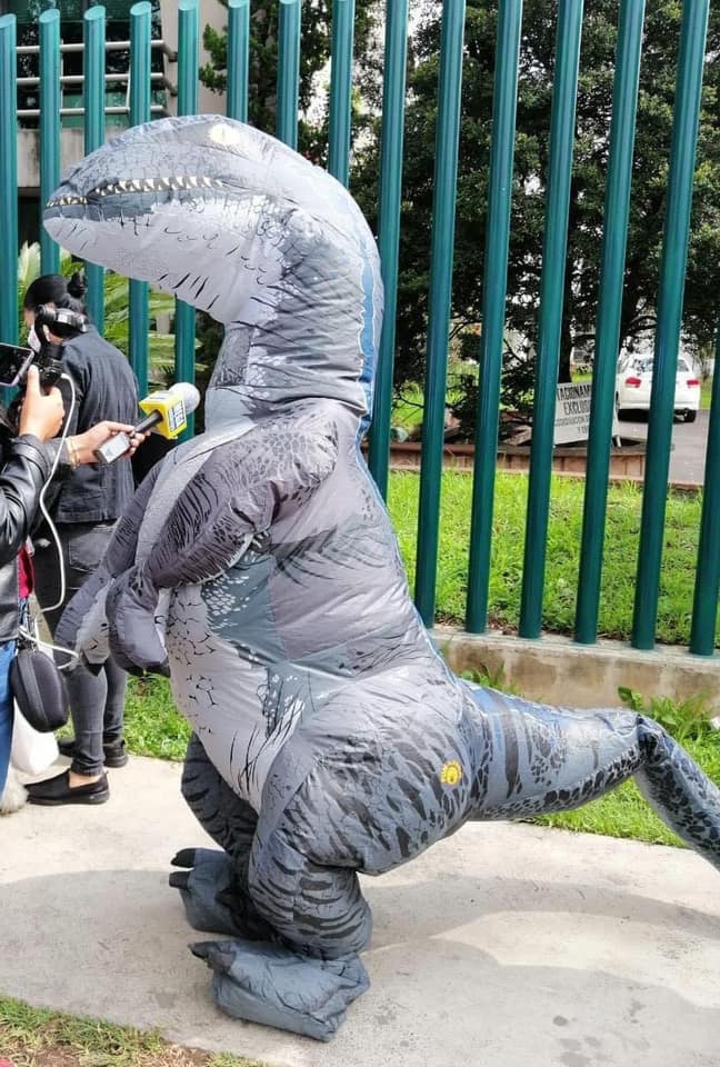 Pasó en Morelia, Michoacán. Mujer usa botarga de dinosaurio para irse a vacunar contra el coronavirus.