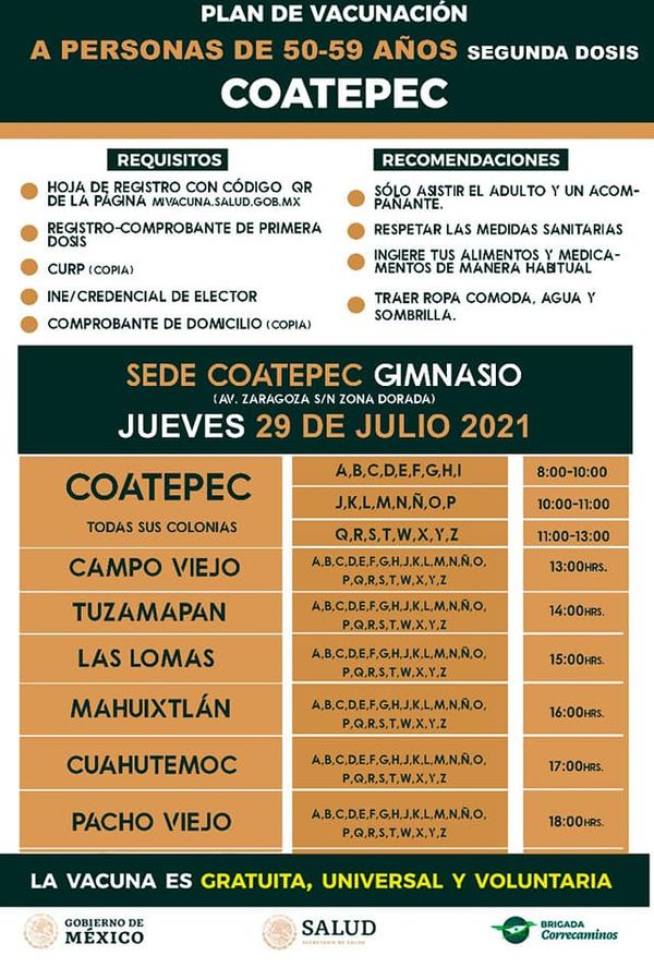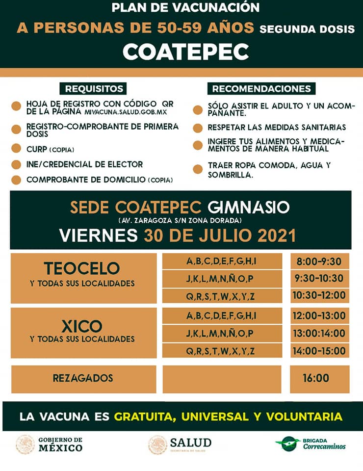 Luego que el delegado de programas del Bienestar, Manuel Huerta Ladrón de Guevara diera a conocer que en Coatepec, Xico y Teocelo se aplicará la vacuna los días 29 y 30 de julio, la subdelegación en este municipio dió a conocer el calendario.