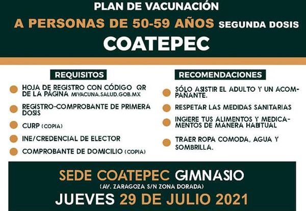 De acuerdo a la información, será el día jueves 29 de julio cuando se aplique la inmunización a los adultos de 50-59 en el gimnasio Coatepec ubicado en la calle Zaragoza; desde las ocho de la mañana y hasta las seis de la tarde se estarán recibiendo a todos los adultos de la zona centro y localidades de este municipio.