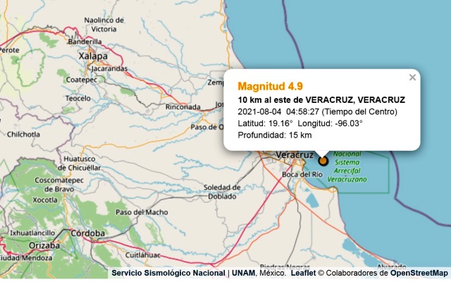 De acuerdo a datos del Servicio Sismológico Nacional, el movimiento telúrico alcanzó una magnitud de 4.9, ocurrió a las 04:58 horas de este miércoles, teniendo su epicentro dentro del Golfo de México, a 10 Kilómetros al Este de la ciudad de Veracruz.