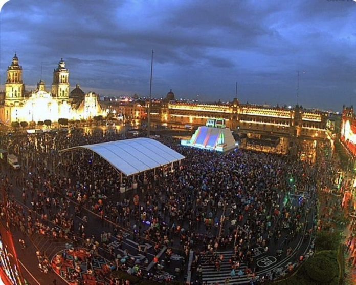 El Zócalo de la Ciudad de México lució el viernes lleno de personas tras la inauguración de la iluminación para conmemorar los 500 años de la Conquista o de la resistencia indígena.