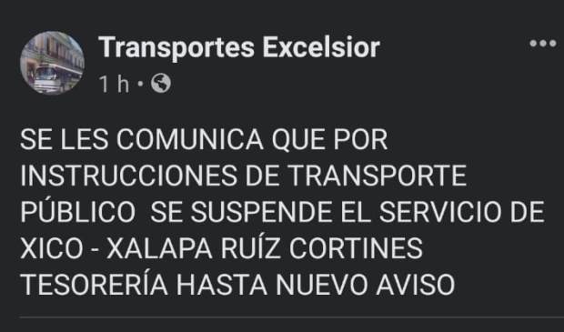 Desde ayer sábado, las líneas de autobuses Alfa, Loma de Oro y Netzahualcóyotl anunciaron la suspensión del servicio en la ruta Xico-Ruiz Cortínes (Xalapa) y Coatepec-Ruiz Cortínes (Xalapa); este domingo se sumó la línea de autobuses Excélsior.