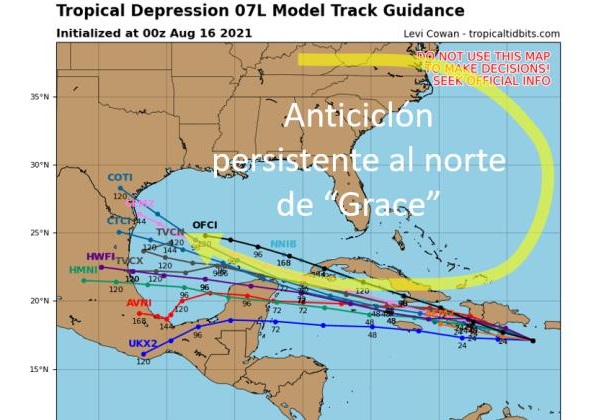 La Depresión Tropical Grace con centro a 250 km al SE de Santo Domingo, presenta un movimiento al Oeste a 24 km/h, y pronóstico de regenerarse a tormenta el jueves sobre el Sureste del Golfo de México y a la cual se le debe prestar MUCHA ATENCIÓN por posibles cambios en la previsión de su trayectoria, informó esta mañana el Centro de Estudios y Pronósticos Meteorológicos de Veracruz.