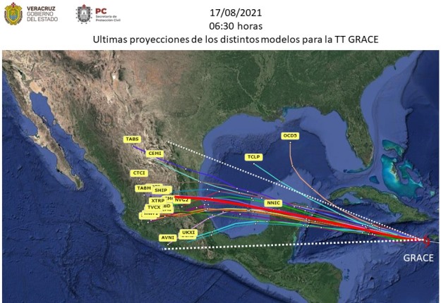 Xalapa, Ver.- Ultimas proyecciones de trayectoria de los distintos modelos para la Tormenta Tropical Grace; nuevamente se separan cuando se movería sobre aguas del Golfo de México, inclinándose más hacia el estado de Veracruz.