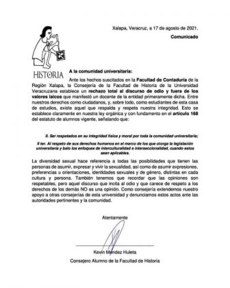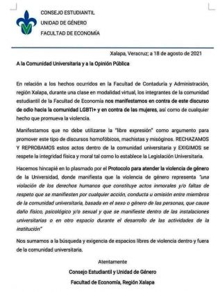 «Me duele que en mi casa de estudios, pase esto, desgraciadamente es una realidad que pensamientos como los de este “académico” están presentes incluso en mi facultad.