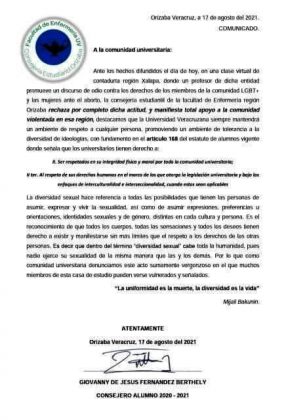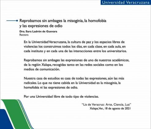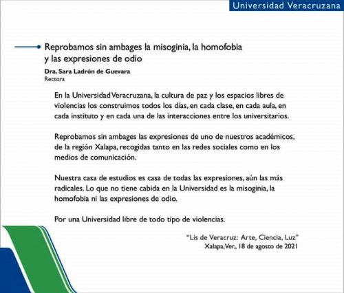 En tanto la respuesta de la Universidad Veracruzana (UV), la rectora Sara Ladrón de Guevara, a través de un comunicado, advirtió que «reprobamos sin ambages la misoginia, la homofobia y las expresiones de odio en la Universidad Veracruzana», sin precisar si habrá castigo para el catedrático.